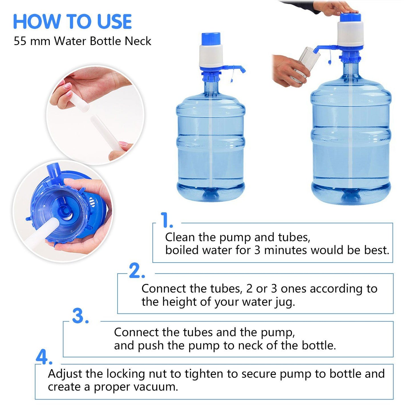 The hand pump is easy to assemble and the pump tubes are removable for easy cleaning. The pump's adapter fits most standard water jugs and can be switched to a different jug in just seconds.